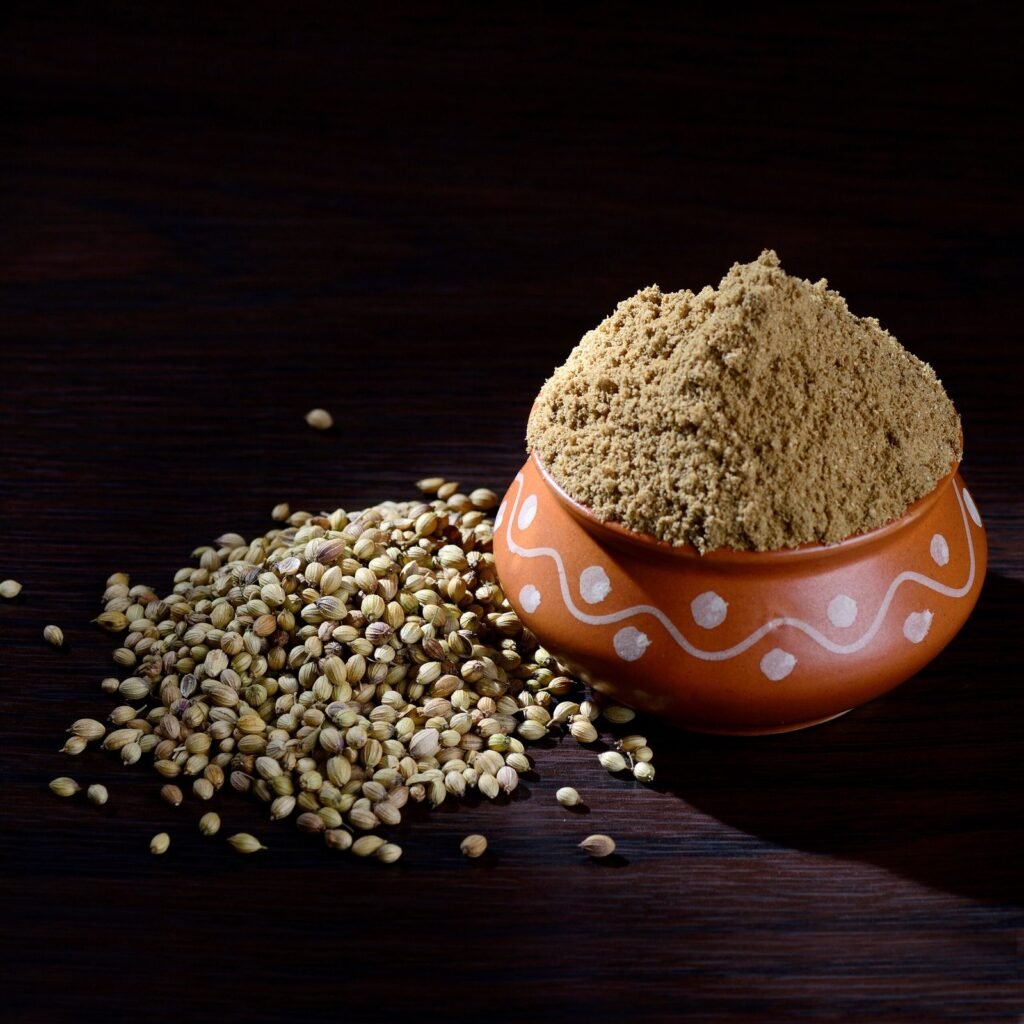 Ground coriander powder, improves digestion and enhances culinary flavor naturally.